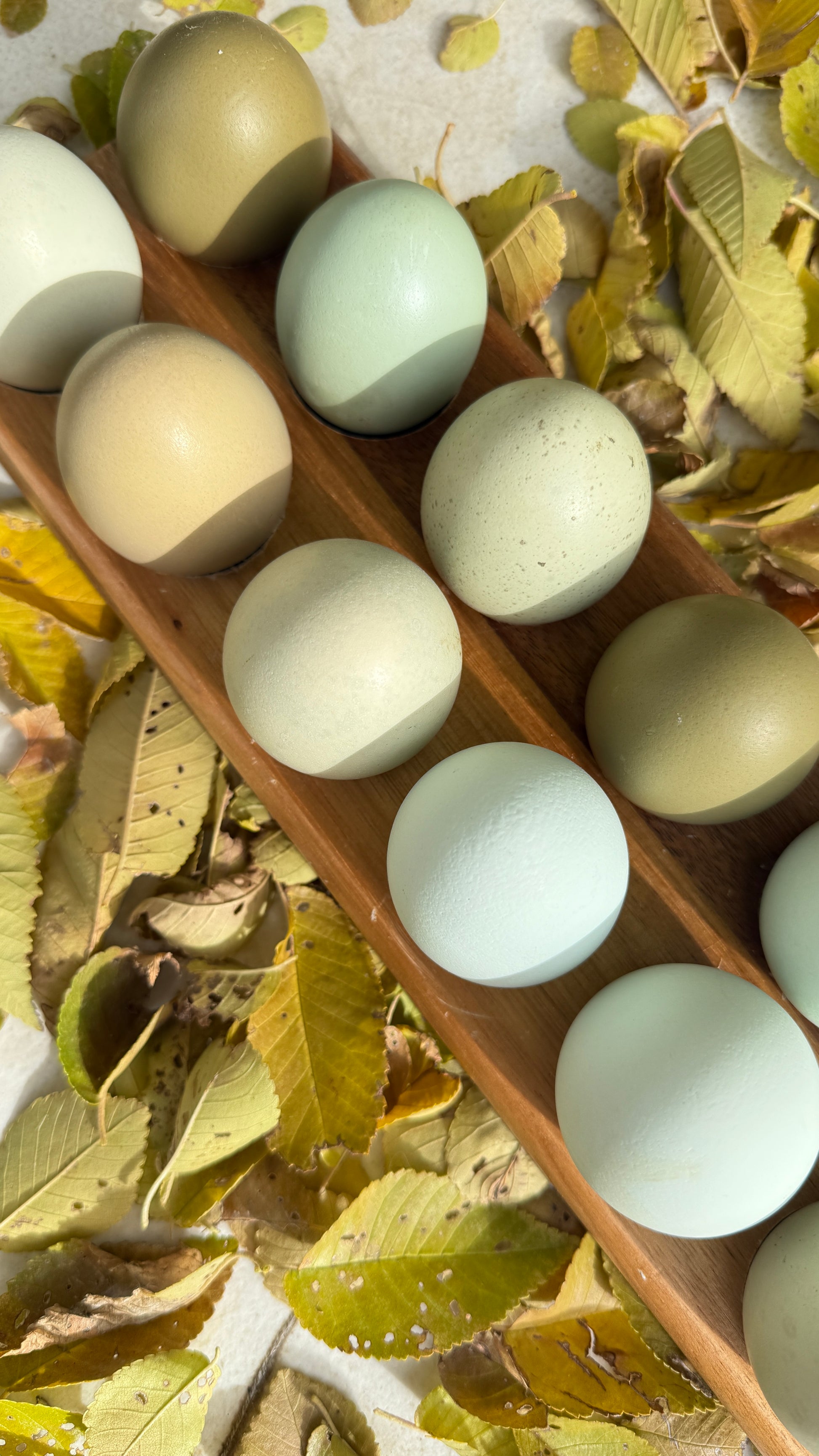 One Dozen Eden Line Hatching Eggs - Curated from our most colorful layers, all covered by our Black Copper Maran rooster. Expect chicks that grow into hens laying everything from deep chocolate browns to mossy olive greens and earthy café tones. While most offspring will produce richly colored eggs, a few may lay lighter browns or tan — adding even more variety to your basket.